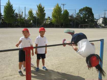 体育では,鉄棒遊びの学習をしています。一生懸命,逆上がりや連続技に挑戦している子どもたちです。親指でしっかり鉄棒を握って練習をしました。