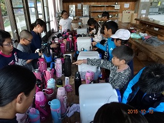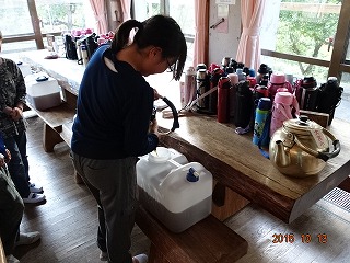 食事係は、優秀です。給水用のポリ缶にやかんのお茶を入れ替えて、上手に水筒にいれていきました。