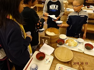 自分の分だけご飯をよそったりする子がいると思えば、お母さんのように、次々とお茶碗にご飯をよそっている子もいます。ご飯のよそい方を見ていても、わかりますね。男の子も、手際よくお茶を入れて回していましたよ。