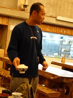 Y先生にご飯をついでもらったN先生。「こんなん、食べきれませんやん」と言いながらも、嬉しそう。