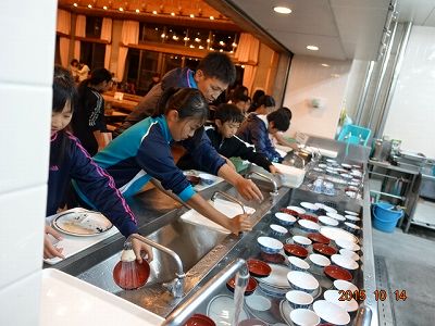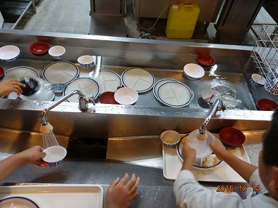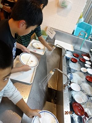 食べた食器は、このようにして返します。簡単に水で食器の汚れを落として、水槽に入れます。当初は、丁寧に手でこすっていたので、えらく時間がかかりましたが、ずいぶんと上手になりました。