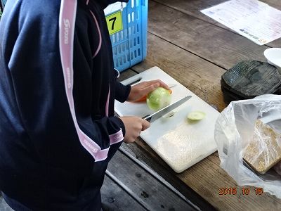 野菜を切っている子どもとは別に、かまどつくりの子どもたちもいます。火の係です。薪を上手に組んで、お鍋のやってくるのをひたすら待ちます。