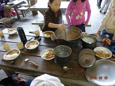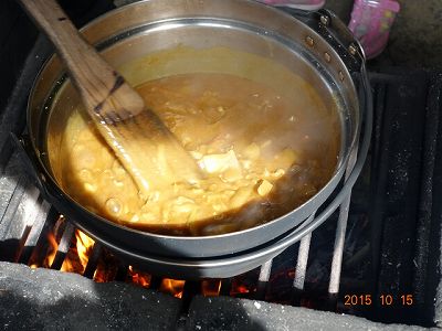 この時期は涼しいので、火のそばにいても、苦痛じゃありません。カレーの完成間近で、うれしそうですねー。