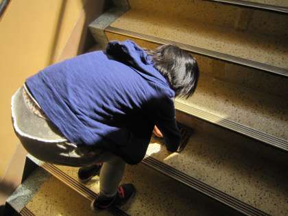 二年生。そうじがんばっています。ろうかもぞうきんがけをして,ピカピカにしています。心もピカピカです。