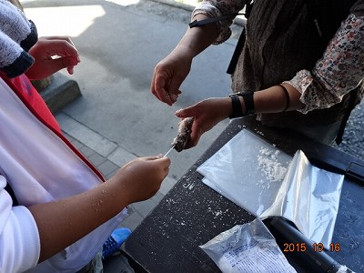 魚に塩をふって,味付けをします。K先生の絶妙な塩ふりのおかげで,とってもおいしかったです。