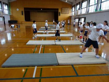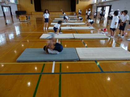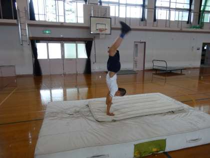 昨年までの技に加えて,倒立前転に挑戦する子もいます。