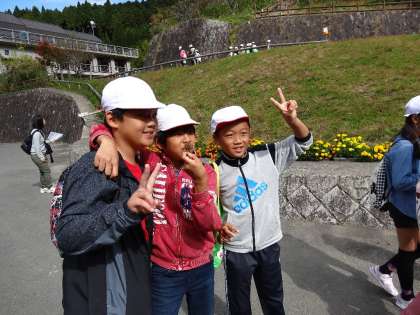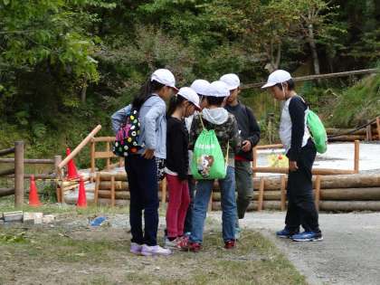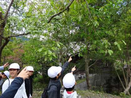 グループで,所内の施設をめぐりながら,途中の自然にビンゴカードに記入していきます。見つけるのがはやいこと,くりをみつけたよ,おいしそうなにおいのする木があるよと,「かつら」の色づいた葉っぱに興味をもったり,林の中のきのこを発見したりしていました。
