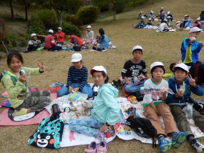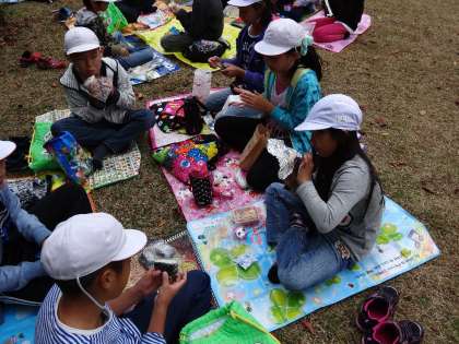 お家の人が朝早くつくってくれたお弁当をおいしそうに食べていました。