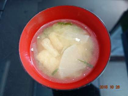 今回の味噌汁は,大根とおあげとネギが具として入っていました。とりわけ,わかめと豆腐の具が大好きです。