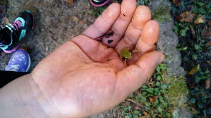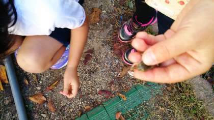 「何の種をとっているの?」と聞きますと,「カエル」という返事。どんな植物なんだろうと不思議に思っていると,軽く握った手をそっとあけて見せてくれました。ピョンピョン跳ぶ「カエル」です。