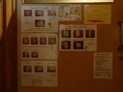 4日後の朝が心配に思えたのですが,みんなぐちゃぐちゃになることなく,整理整頓を心がけてくれていました。この張り紙は,4日目の朝にとっても活躍しました。どの部屋も,埃っぽくなるからドアを開けて換気していたのですが,みんなドアをしめていくのです。なんでだろうと思って見に行くと,一生懸命たたみ方をみて,シーツや毛布をたたんでいました。大宮っ子,すごいぞ!