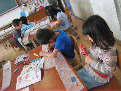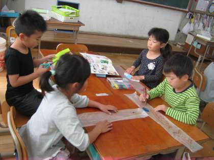 図工で、「なにがでてくるかな」の学習をしています。袋に絵を描いて,ストローを差し込み,息を入れると膨らむ仕組みです。この日は,袋に自分の好きな絵を描きました。次は,袋を入れる箱を飾り付ける予定です。今から楽しみにしている子どもたちです。