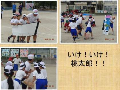 家来の筈の「さる」「いぬ」「きじ」が先に行ってしまい,主役の「桃太郎」が置いてきぼりを食らってしまう場面もありました。でも,最後は4人一緒にゴールです。