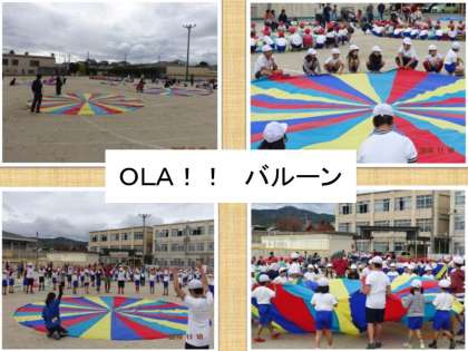 大きなバルーンを広げて,みんなで端っこを持ちます。真ん中に集まったり開いたりしながら動くと,ほれこの通り。