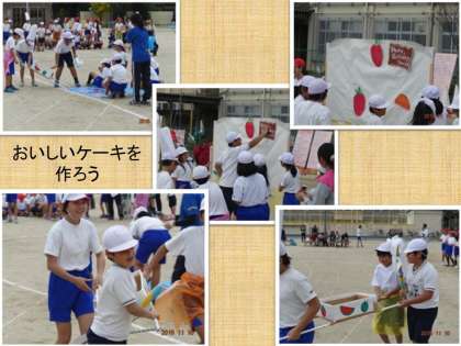 バルーンの後は,リレー「おいしいケーキを作ろう」です。ケーキのパーツを一つずつ運んで,ケーキを作ります。どんなケーキができるのか! 乞うご期待!!