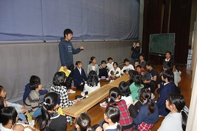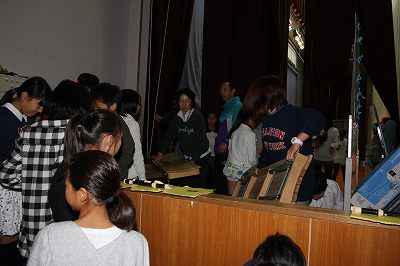 その前に,ちょっと開演前の舞台裏をご紹介。ごった返しています。舞台の上では担任のN先生が,子どもたちを前に気合いを入れています。