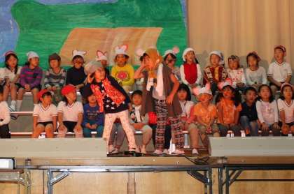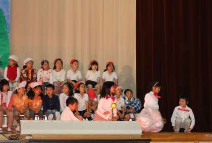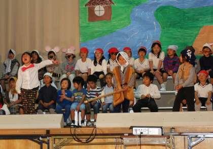 おにぎりをもらったお礼に,ネズミちゃんたちが宝物をおじいさんとおばあさんにあげました。