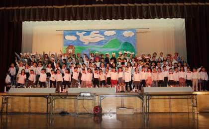 みんなが舞台の上に上がって,歌を歌いました。