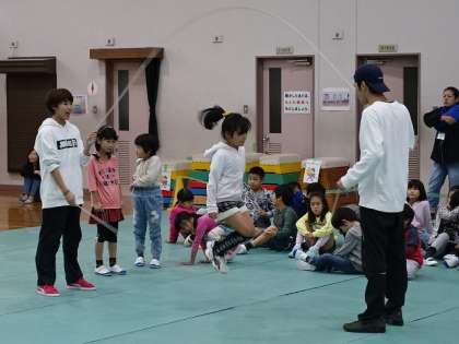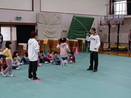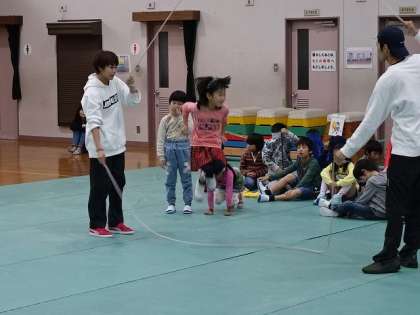 縄を回してくださっているインストラクターの方も,子どものジャンプに合わせて回すスピードを変えるなど,工夫をしてくださっているのが分かります。ジャンパーとターナーの息が合わなければいけないんですね。早速,覚えたての言葉(ターナー)を使ってみました。