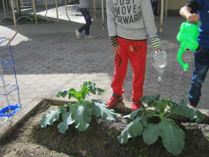 水をあげると,今日も水滴を元気よくはじくブロッコリーと芽キャベツです。
