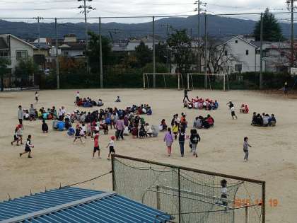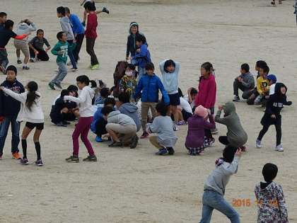 これはまずいぞ・・・・と思った瞬間,運動場で遊んでいた一団が,運動場の真ん中に集まって,頭を抱えて座り始めました。