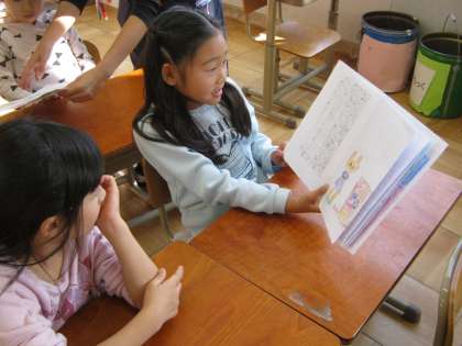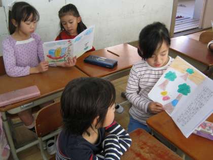 何度も教室で読む練習をしてから、行きました。ドキドキしていたようですが、一生懸命、読んでいる様子はとてもすてきでした。。読んだ2年生も、読んでもらった1年生も満足したようです。