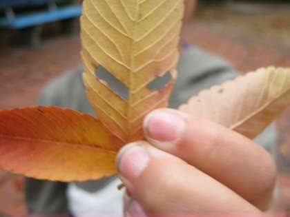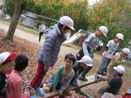 国語で「しらせたいな,見せたいな」の学習をしています。今日はしらせたいもの,見せたいものを探しに公園へ行きました。木々の葉が赤や黄色に色づいていました。子どもたちは,「このはっぱきれいだなぁ。」「どんぐりがいっぱい落ちているよ。」と楽しそうに探していました。知らせたいものを見つけ終わった後,公園で元気いっぱい遊びました。