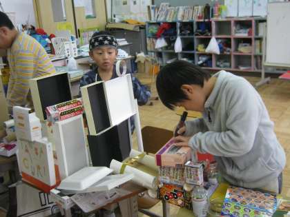 お菓子の箱や,コーヒーの缶など,普通捨ててしまうようなものでも子どもたちの想像がどんどん広がっていくのが素敵でした。