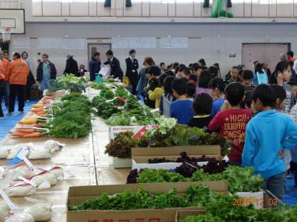 今日は,大宮小学校の体育館で,地域の野菜の品評会が行われました。地域の勉強を社会科でしている3年生が,見学に訪れました。