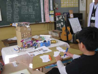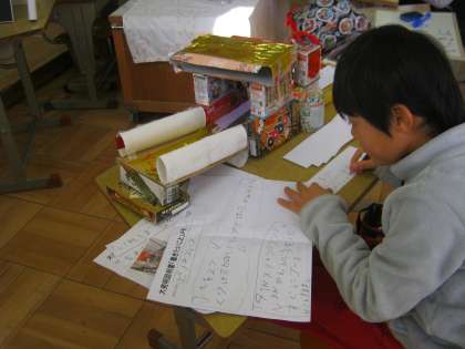 発明品のよさが伝わる説明書を作るために,一生懸命紙に言葉を書く子どもたちでした。