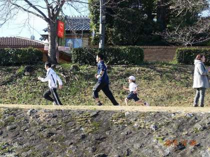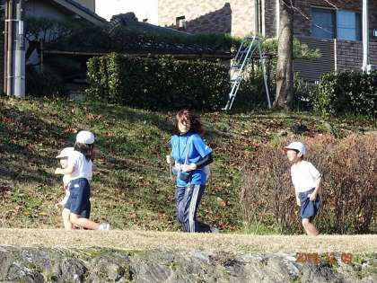 マラソンと言えば,先導する白バイが思い浮かびます。白バイの代わりに,教務主任のK先生と事務のN先生が先導。負けじと,追いすがる1年生。K先生,本気の走りです。