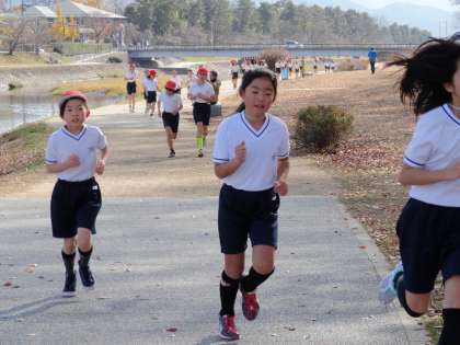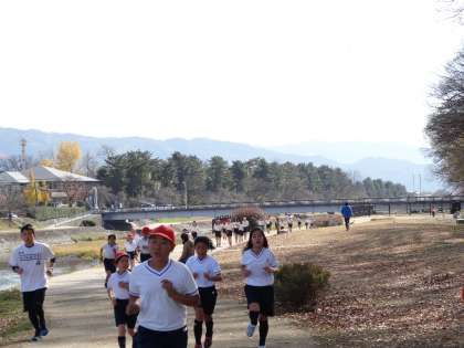 体育の「ジョギング」では,心拍数を計測して,自分にあった運動負荷をかけていくことを学習しました。写真を撮った地点は上賀茂橋西側になります。この地点でも自分の運動負荷にあったペースで走り続けています。これを機会に,来年の大文字駅伝予選を目指してくれるといいですね。