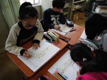 子どもたちは鳥獣戯画について高畑勲さんが書いた文章の工夫を見つけます。