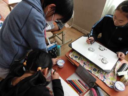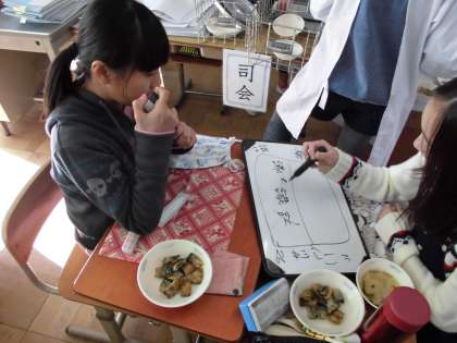 絵をかいたり文字を書く競争をしたりして給食が配られるのを待ちます。