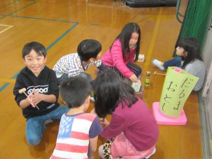 だるま落としやゴム跳び,竹がえしといった遊びもありました。ゴム跳びや竹がえしは慣れるまでに少し時間がかかった子どもたちもいるようですが,慣れてくると楽しく遊ぶことができました。