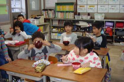 3年生各担任が腕を振るって作ったすぐきのみそ汁を食べました。「おいしい!」と言いながら食べ,おかわりにはすごい行列ができていました。作った先生達も大満足でした!