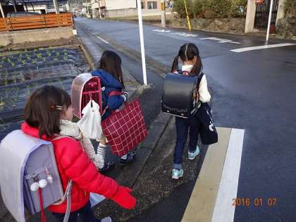さて,どの子どもたちも,大きな荷物を下げながらの登校。