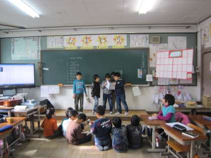 二枚目はクイズをしているところです。なぞなぞとクラスにまつわるクイズをしてくれました。「先生が一番きらいな虫はなんでしょう」というクイズに元気いっぱい答えてくれていました!