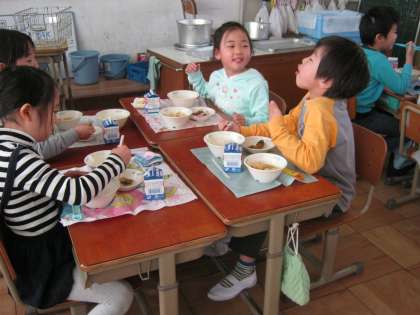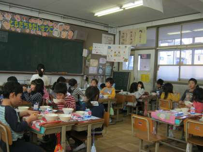 4月の時と比べると,もりもり食べられるようになった一年生。ほとんどの日,食缶が空になります。給食が食べ終わると,残ったご飯をおにぎりにして食べています。ぐんぐん成長してほしいと思います。