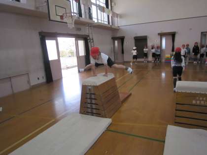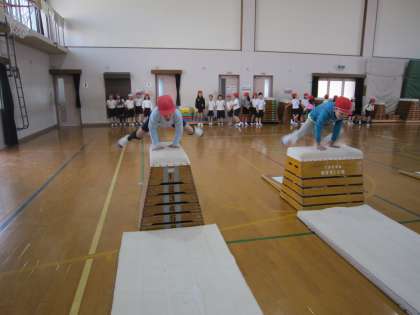 体育の学習で,とびばこあそびをしています。いろいろな高さのとびばこをいきおいよくとんでいます!!