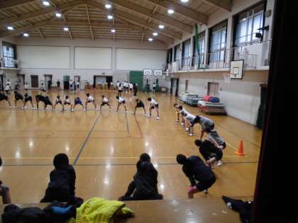 けがをしないように準備運動をして朝から体を動かします。