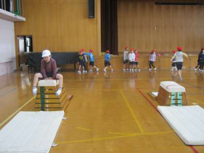とびばこを飛び越したり,手を叩いて上から飛び降りたりしました。
