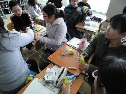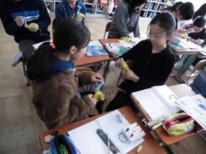 手回し発電機を使って学習をしました。速く回したら…友だちとつなげたら…