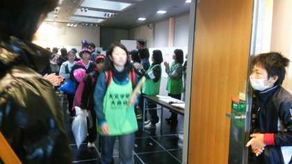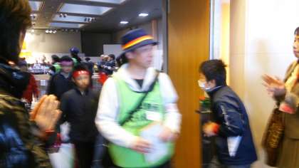 受けた後,みんなに拍手をされ,中継所に送ってもらうバスに向けて