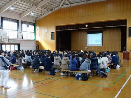 体育館で,入学に関する事務手続きや,健康・生活などの説明を行います。