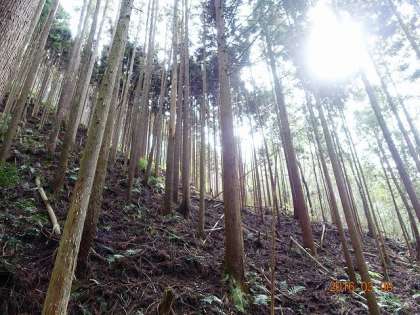 このあたりの山も,北山杉を産しているのでしょうね。枝がきれいに払われています。下草も駆られていることと,等間隔に木があることから,植林されたことが分かりますね。この写真をしっかりと覚えておいてください。後で,比較をしてもらいます。