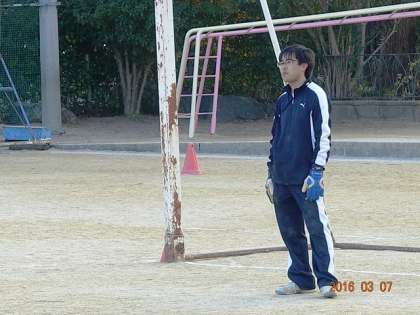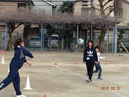 M先生のスローイング。U先生は,ボールにあまり興味がなさそう。平然としています。U先生にボールを渡しているのに,早く取りにいかないと!