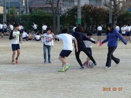 おっと,U先生がいきなり復活してボールを取りに。少し遅れて,4年のK先生も参加しましたが,ボールには届かず・・・残念!