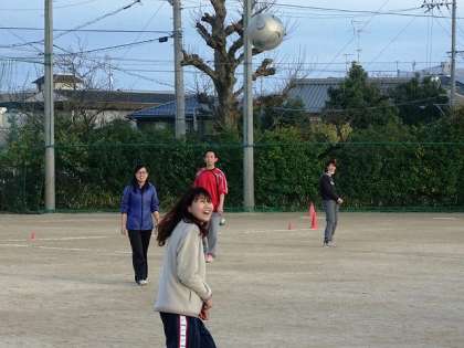 大きなパスが2年G先生のもとへ! イヤ〜ンと言いながら,ボールから逃げていきます。ちょっととるのは難しそうですね。