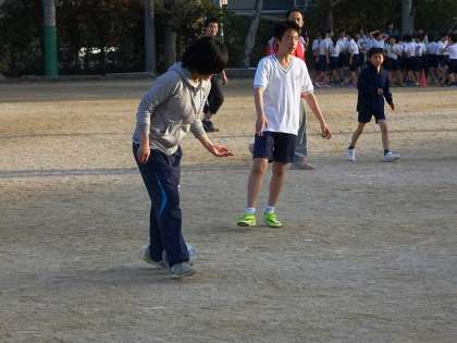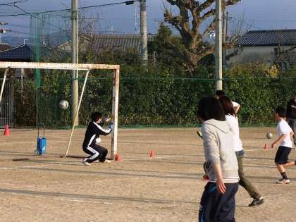 4年生のI先生は,上手に足にボールを挟んでいます。